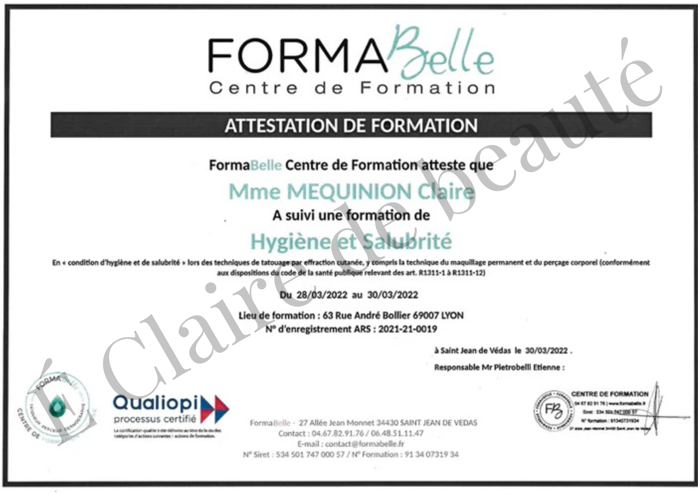 - Hygiène et salubrité – Diplômée pour vous assurer des soins sécurisés et respectueux des normes.